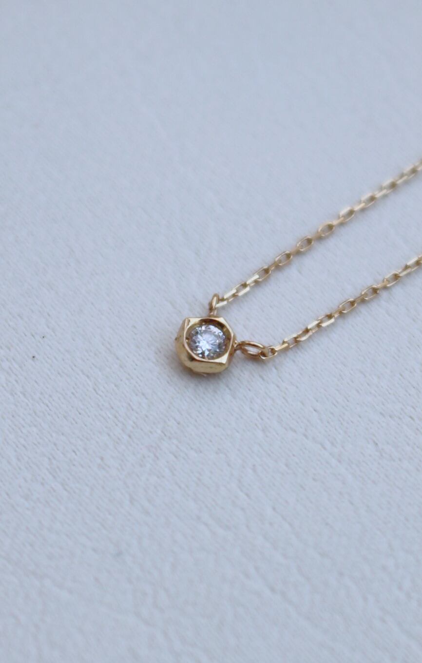 ”私の星”と名付けたこちらのネックレスは、ダイヤを囲う地金部分に小さなカットを入れることで、こだわりの高品質なダイヤモンドをさらに輝かせました。